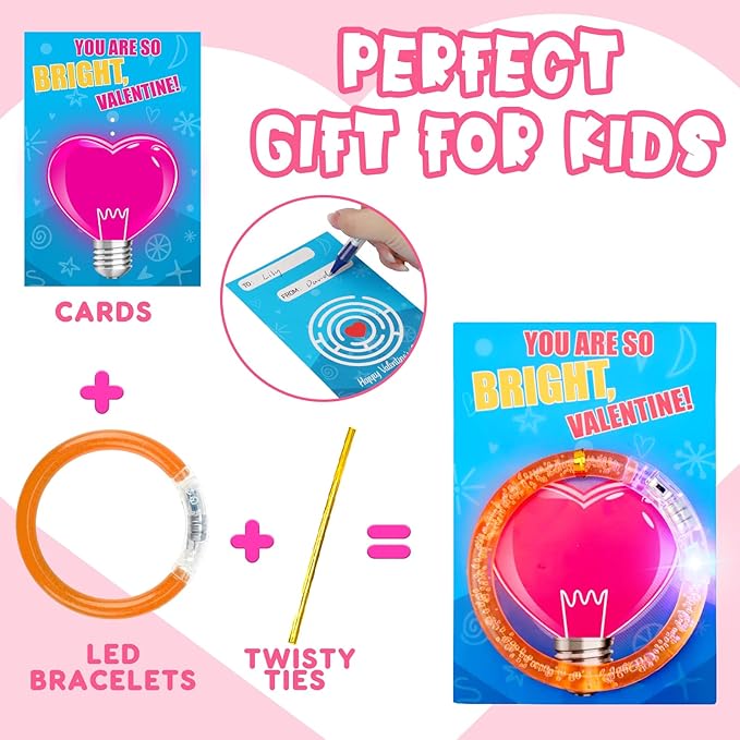 - 【Perfect Valentines Gifts for Kids Classroom】Our Valentines day gifts for kids includes 24pcs LED light up glow in the dark bracelets, 24pcs valentine cards and twisty ties. Flashing LED lights create a fun atmosphere for kids’ valentine party. Pick suitable colors for different friends. Great Valentines day exchange cards for kids classroom!