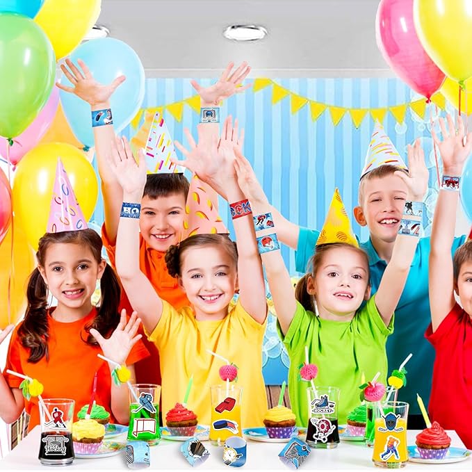 - Ice Hockey Slap Bracelets: Ice hockey bracelets are made of safe and harmless materials, strong and durable, will not scratch your skin, very safe for children. Put ice hockey bracelet on your wrist and press lightly, and it will form a comfortable circle and wear it firmly on your wrist. The ice hockey birthday decorations are printed with various ice hockey theme patterns to make your ice hockey party more attractive