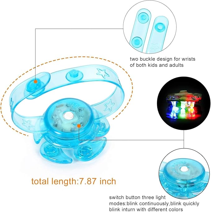 - Kids Return Gifts for Birthday Party - Double buckle design suitable for wrists of different thicknesses, possible to be worn by both elders and children. The wrist buckle closes firmly, which won't loose when the children playing with light up bracelets. LED lights make sure they last a long time. You can use these without turning lights on during the day to have something to fiddle with. You can still use it as a fidget toy forever.