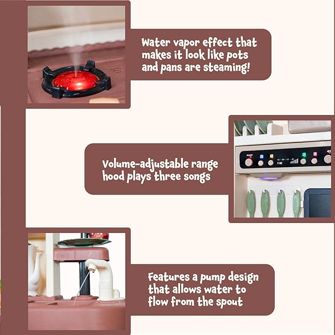 - REALISTIC EFFECTS: The little ones will enjoy playing pretend with many usual features. It includes sliceable fruits and vegetables that are held together with hook and loop fabric fasteners and can be easily cut apart using the included plastic knife. Add water to the reservoir in the left burner to create a water vapor effect that makes it look like the pots and pans are steaming. Fill the sink basin with water and use the pump faucet to create the appearance of a real working sink.