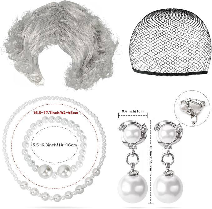 - Complete Old Lady Outfit: Includes 1 old lady wig,wig cap,faux pearl necklace, bracelet,clip-on earrings, glasses with chain, cane, and floral apron with pockets, everything your child needs to become a cute little grandma