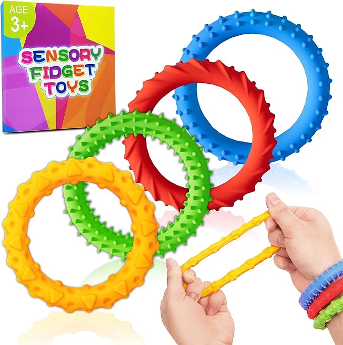 Sensory Fidget Toys for Kids Toddlers Stocking Stuffers 4PC Stretchy Texture Fidgets Bracelet for Autism ADHD Boy Quiet Figette Anxiety Relief Silent Calm Down Silicone Stress Toy Classroom Prizes