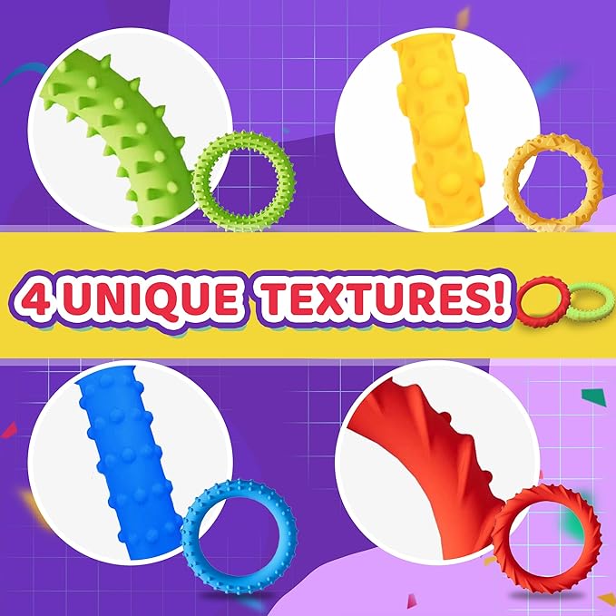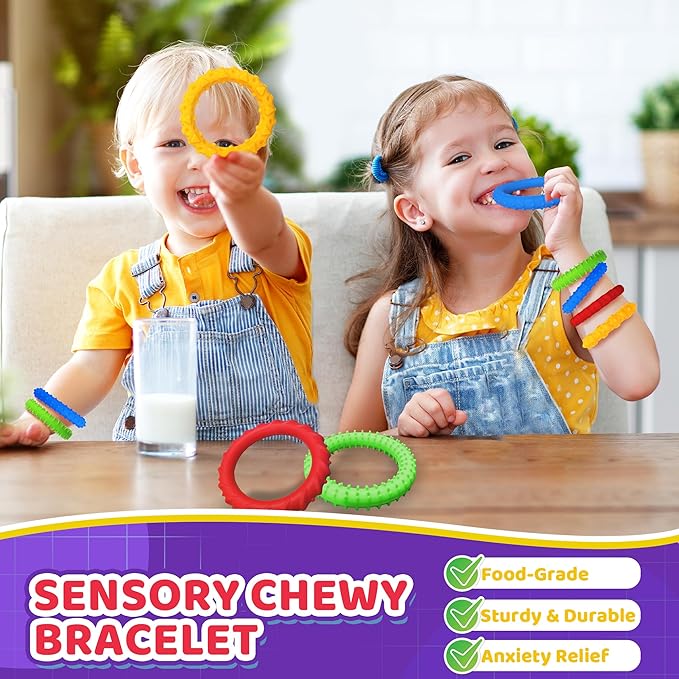 - 【Fidget Bracelet for Kids Adults】Our Sensory Texture Bracelets come in four different vibrant colors and special textures to provide a satisfying sensory experience. They can be touched, stretched, and chewed to keep toddlers, children, teens, and adults busy, distracted, and relieved of stress