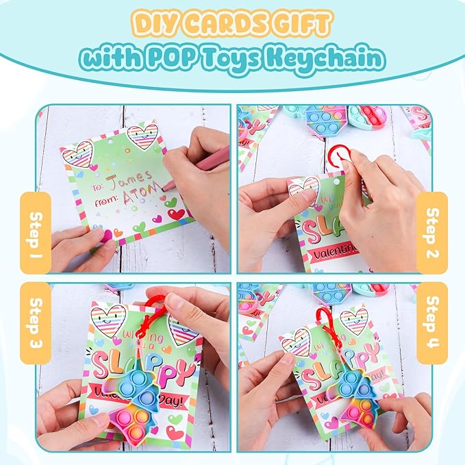 - Valentines goodie bags filler: includes 24 Valentine's day cards and 24 Pop Valentines Fidget Toys Bulk with Keychain,24 valentines cards (4 designs)Valentine card size 4.71inx3.2in