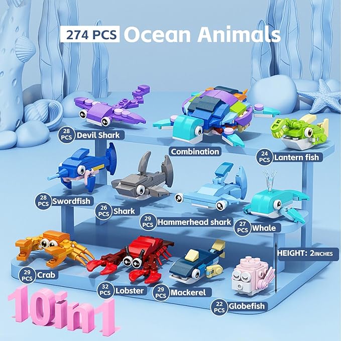 - 【MINI ANIMALS BUILDING SETS】This building sets has a total of 20 packs 583 pieces. It has Bird Paradise and Ocean Animals two series. Includes 20 kinds of animals model like Ostrich, Peacock, Hummingbird, Crane and Fish, Shark, Lobster, Crab, Whale and more. And also you can combine them to create larger animal models. Added endless fun for all your family. Designed for kids aged 6 7 8 9 10 11 12+. Maybe it has challenging for younger kids, adult assistance is recommended.