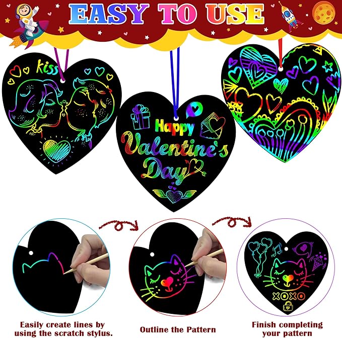 - [Endless Possibilities]: Perfect for school Valentines for classroom settings, gather friends and family for a DIY scratch paper session. Display the creations with the cords as Valentines Day accessories or as kids Valentines gifts. Ideal for kids Valentines Day gifts for school, or as thoughtful classroom Valentines Day gifts for kids.