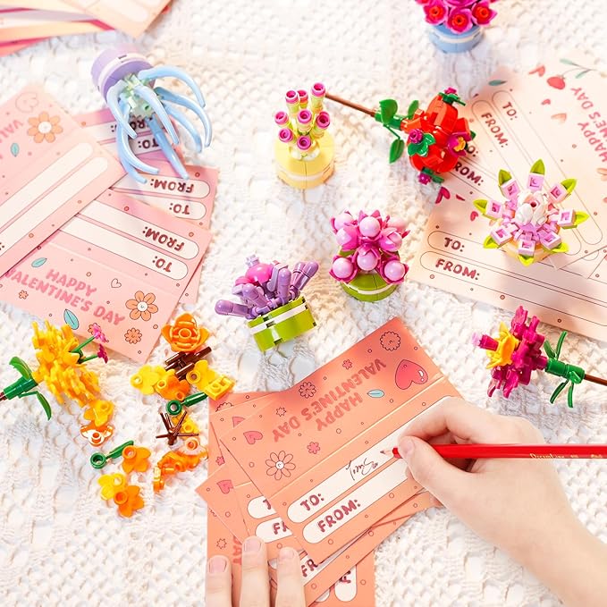 Valentines Day Gifts for Kids, Valentines Day Cards for Kids School with Flower and Succulents Building Blocks, Ideal for Kids Classroom Gift Exchange Building Set, Valentine Party Favor, 24 Packs