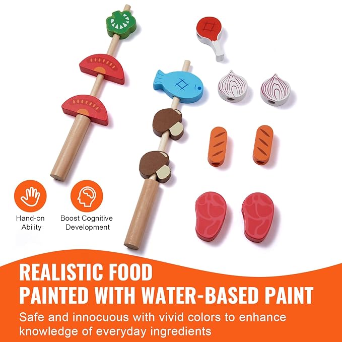 - Fun Grill Playset: Unleash your little chef's imagination with our vertical wooden BBQ grill playset! It's the ultimate addition to their toy kitchen, where they can create culinary magic alongside other kitchen toys. Match ingredients, slap them on the grill, fire up the stove with a click, sprinkle on spices, flip the ingredients with tongs, and dish up fun for friends and family. It's a cooking adventure that sparks joy and creativity!