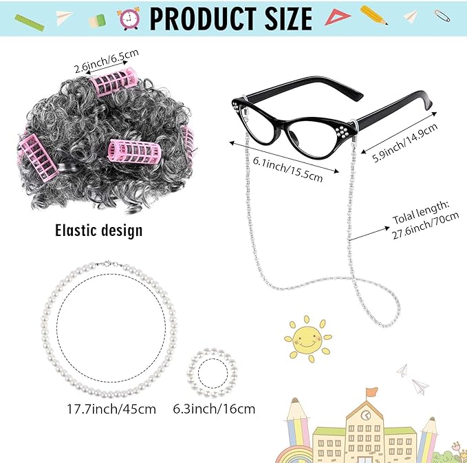 - Package Include: This 100 days of school old lady costume set includes 1 old lady curly wig, 6 pink curlers, 1 100 days of school printed T-shirt, 1 plastic cane, 1 pearl necklace, 1 pearl bracelet, and 1 pair of glasses with a matching glasses chain. It comes with everything pictured, and the quantity is enough for you to complete your outfit.