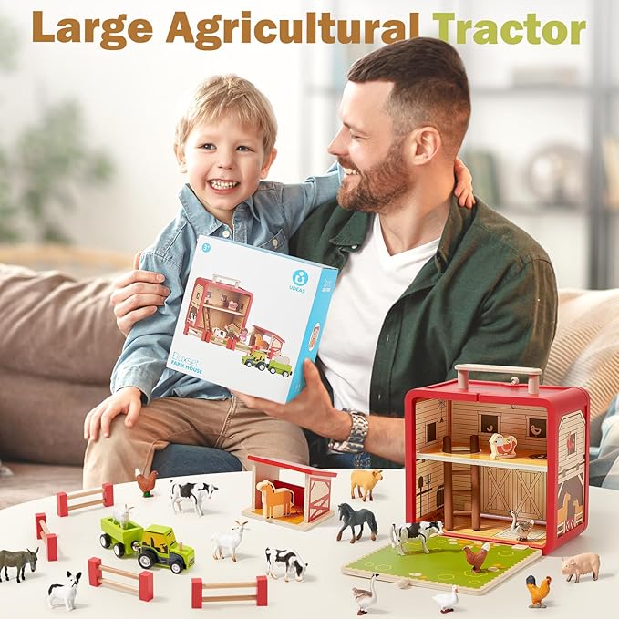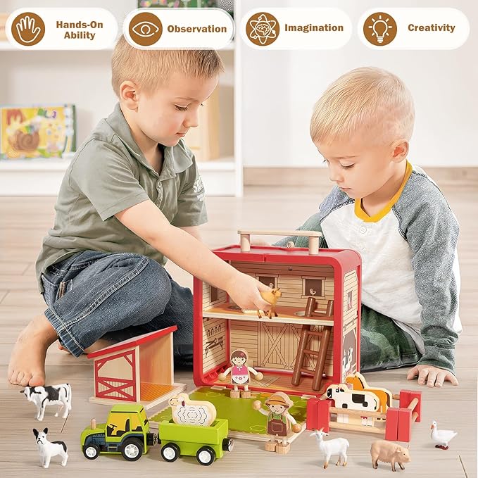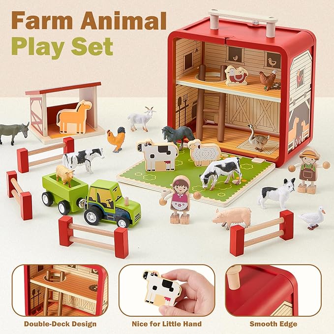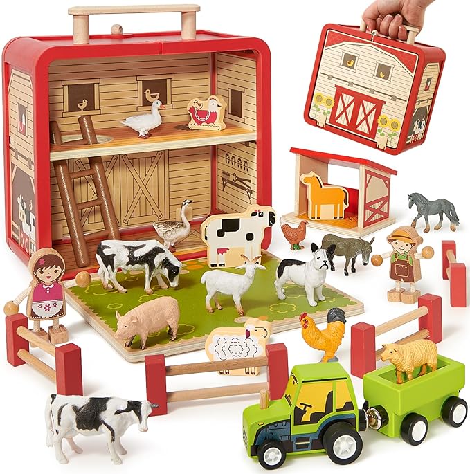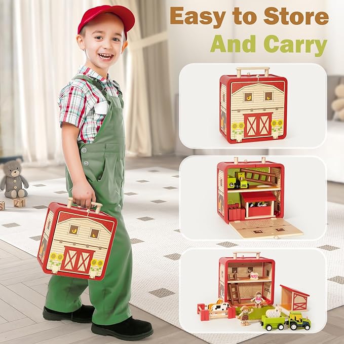 - SAFE & PORTABLE: Our farm animal toys are carefully made of high-quality solid wood and painted with cute patterns. All edges are smoothed and without sharp corners and burrs, perfect for pretend play and learning for 3-6 year olds. The spacious, sturdy wooden barn allows children the freedom to store and display their farm treasures. The folding handle and carabiner make it easy for kids to carry it to the outdoor play area
