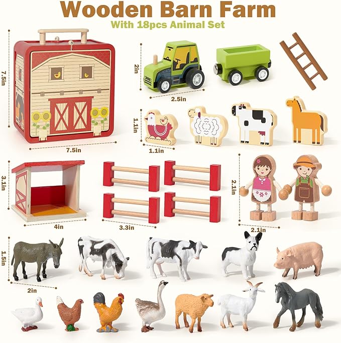 - FUN WOODEN TOYS: Set includes 1 big red wooden barn and 4 fences, 1 animal shed, 1 ladder, 1 green tractor toy, 2 farmers 4 animal blocks and 12 animal models (cow, pig, horse, donkey, sheep, goat, dog, rooster, hen, duck, goose). The Dream Farm Toy set is more than just a set of toys, it's a great tool for preschoolers to explore, learn about farming and develop responsibilities. Kids can immerse themselves in creating farm kingdom and have screen-free time