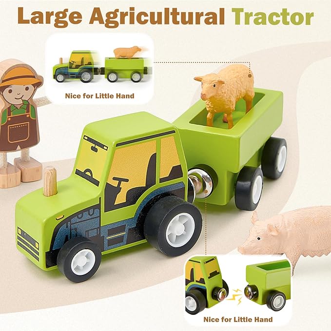 - THOUGHTFUL & UNIQUE DESIGN: Imagine your child's surprise when they open the wooden farm house and see the double floor design of the barn and the rich animal models! We also carefully designed a stable and many fences, children can freely build their own farm, so that the game more realistic and full of life! We also designed two small cars that can be moved together by magnetic contact, and the children can simulate the farmer leading the small animals anywhere