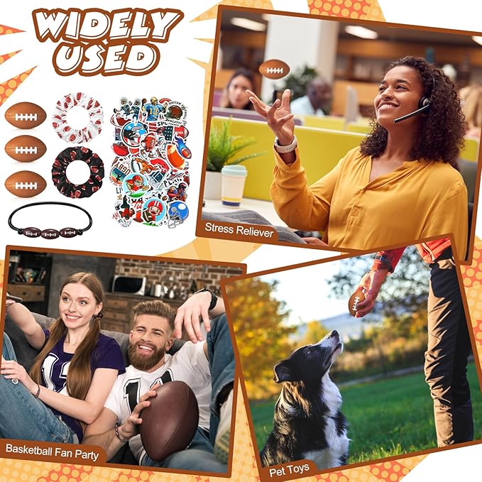 - Widely Applicable: football balls can be applied to release stress and ease the tension; Football wristband bracelet with cute, simple and adjustable design, accompanied by striking sports football bead decoration, can be wear to show team spirit and show others they are a team; Stickers can be applied to decorate your water bottle, tablet PC, laptop, scrapbooks, computers, skateboards, and more, football scrunchies can be applied to tie your hair or put on your hand