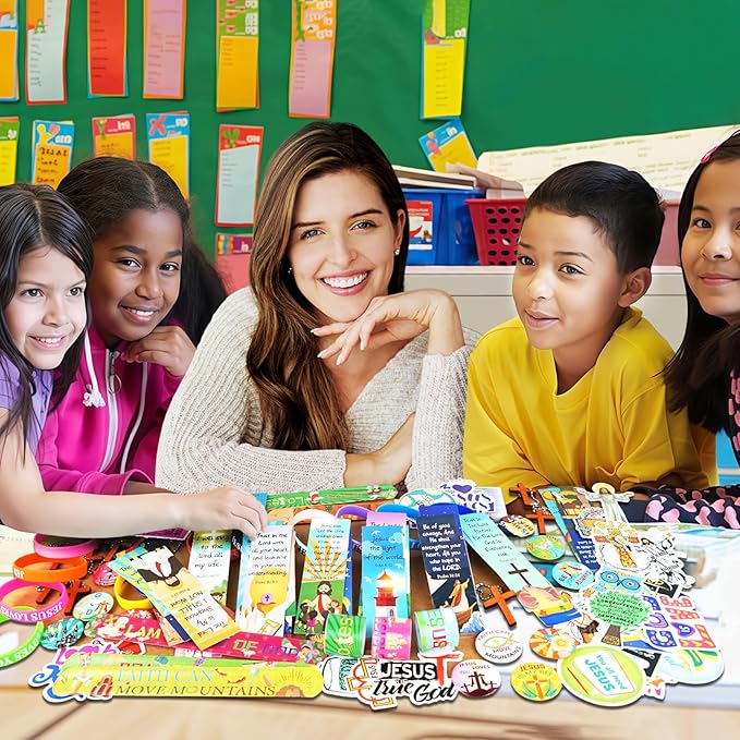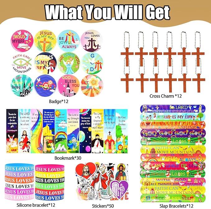 - VALUE 128PACK:You will receive a set of 128 Christian christmas gift packages, which includes 12 cross keychains, 12 Christian slap bracelets, 12 Jesus silicone bracelets, 12 Christian badges, 30 Bible bookmarks and 50 mini Christian stickers.A variety of fun accessories in sufficient quantity for you to share with friends and family at Bible, religious-themed, Christian or Sunday School parties.