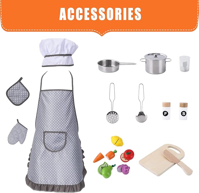 - INCLUDING: There is 1 wooden kitchen playset and 20 pcs cookware Accessories - chef hat, apron, oven mitt, pot, seasoning jar, plate, spatula, ice cube models, wooden cutting fruit and vegetables set. The set will be a ideal gift to help kid learn the basic skill about kitchen and cooking.