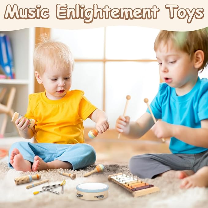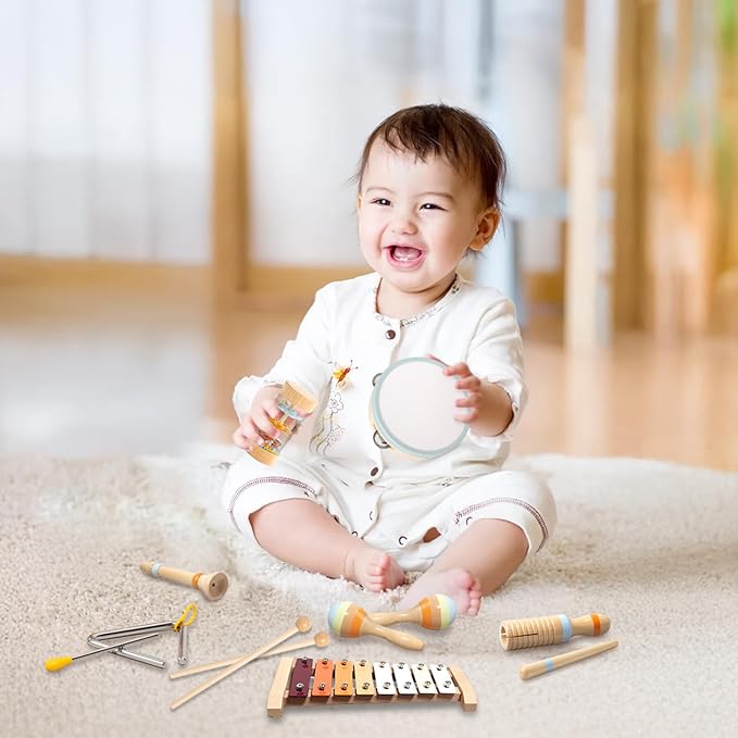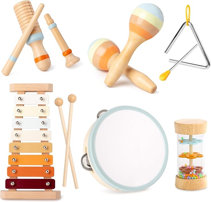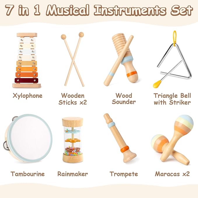 - [Toddler Musical Instruments]-Baby musical instruments with various accessories can make different beautiful sounds including Tambourine, Xylophone, Trumpet, Triangle Bell, Maracas, Wood Sounder, and Rainmaker total 7 kinds of musical toys to expose your mini-musician to different tones, volume, and rhythm, which is attractive to kids.