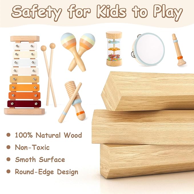 - [Safe Wooden Musical Toys]-These baby musical instruments are made of high-quality natural wood with non-toxic water-based paint. Toddler toys of the surface is round-edge design that carefully polished and smooth, without burrs and sharp corners, and will not damage the baby's soft skin.