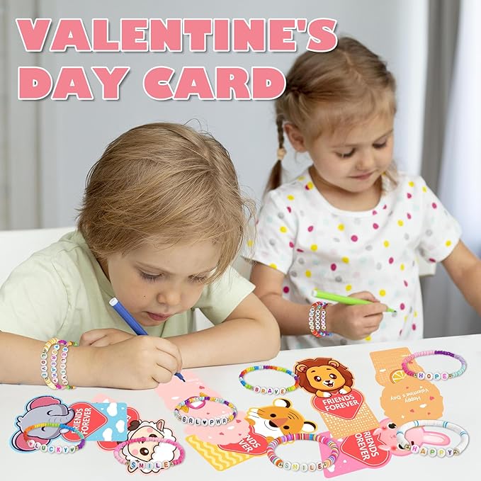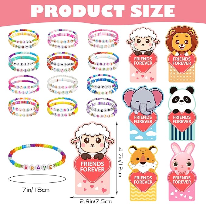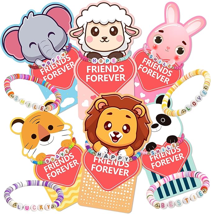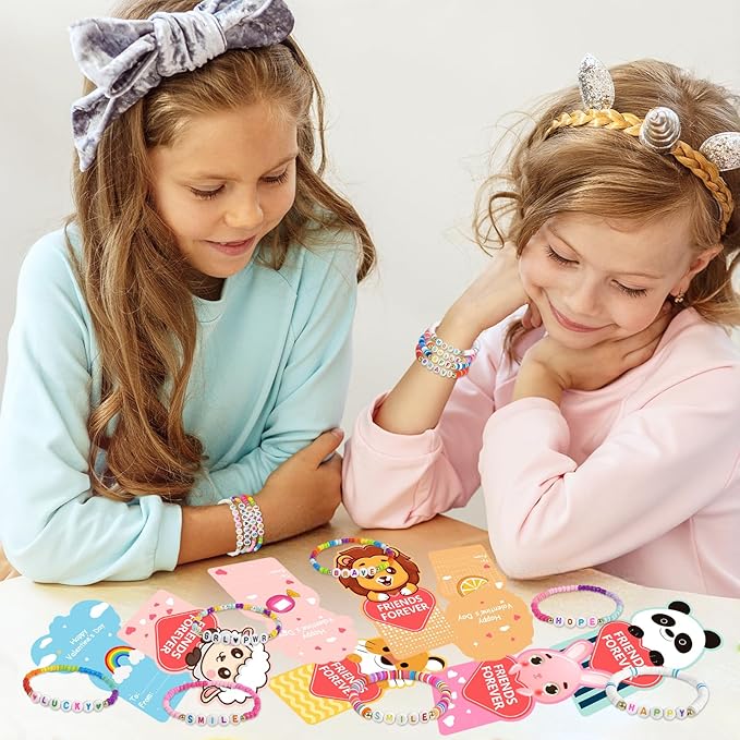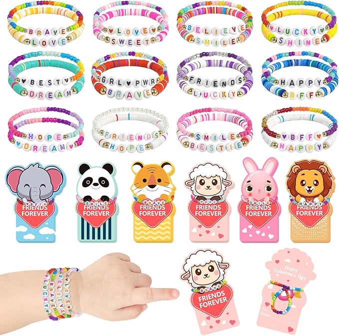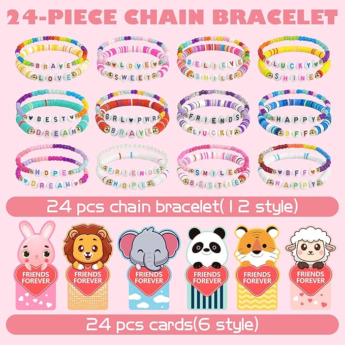 - Friendship Bead Bracelets:24pcs bead bracelets within this collection feature distinctive letter designs, such as [LOVE], [FRIENDS], [LUCKY], [HAPPY]etc, In this special day, it is the most sincere wishes from children to their friends and classmates. It not only adds an element of joy to sharing but also fosters new friendships, enhances social skills, and teaches children the importance of expressing gratitude and love.