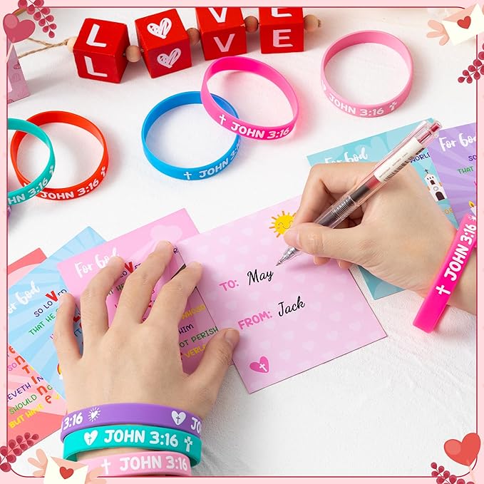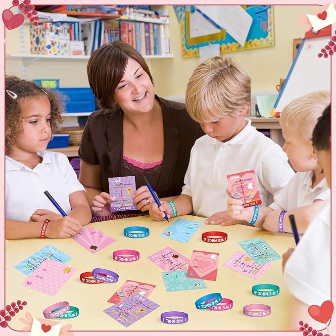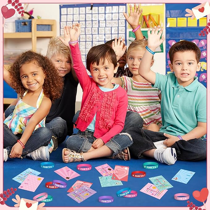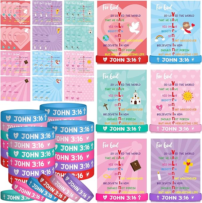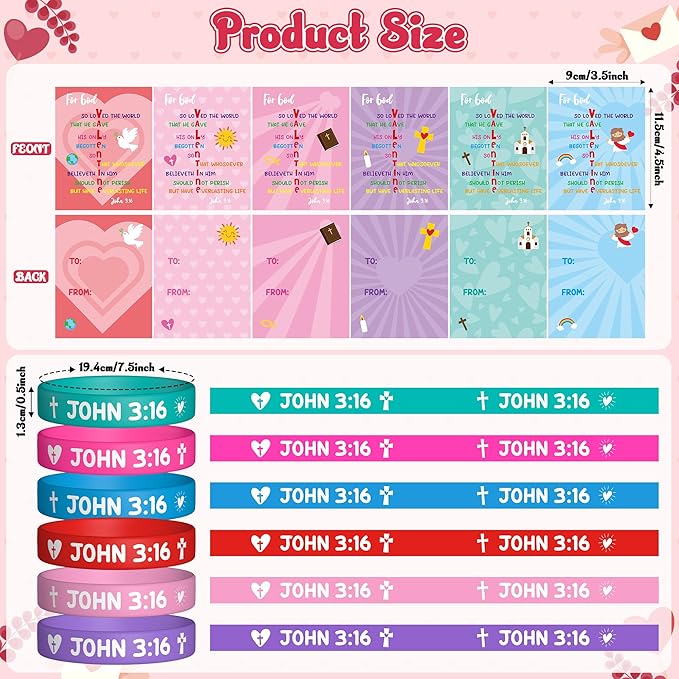 - Valentine's Gift Set: You will receive 36 Valentine's Day religious exchange gifts including 36 valentine's religious cardstock (6 styles) and 36 religious silicone bracelets (6 styles). There is a wide variety and enough for classes and teams to use at Valentine's Day parties and celebrations.