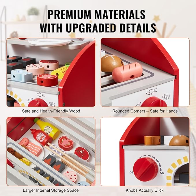 - Fun Grill Playset: Unleash your little chef's imagination with our countertop wooden BBQ grill playset! It's the ultimate addition to their toy kitchen, where they can create culinary magic alongside other kitchen toys. Skewer ingredients, slap them on the grill, fire up the stove with a click, sprinkle on spices, flip the ingredients with tongs, and dish up fun for friends and family. It's a cooking adventure that sparks joy and creativity!