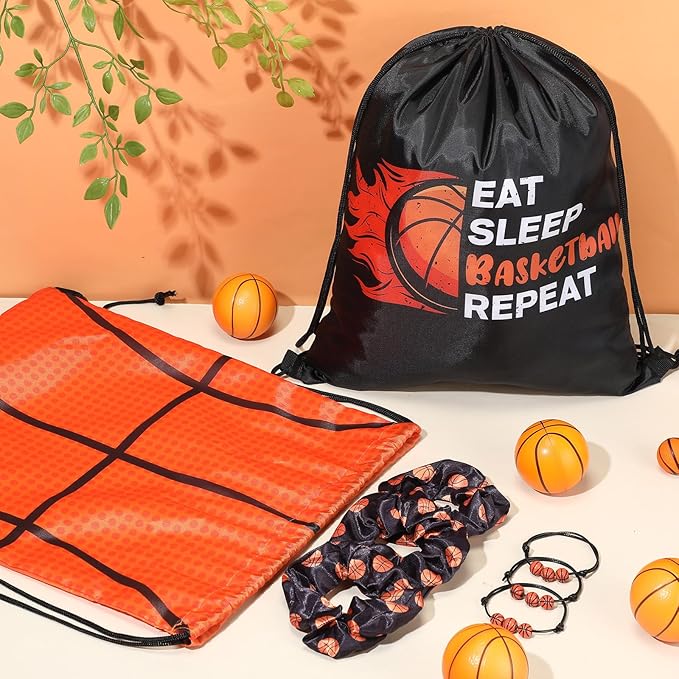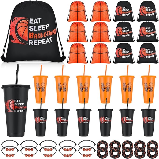 Yungyan 48 Pcs Basketball Party Favors Set Basketball Goodie Bags 24oz Basketball Cups with Lids Sport Drawstring Bags Basketball Hair Ties Bracelets for Team Gifts Basketball Party Supplies