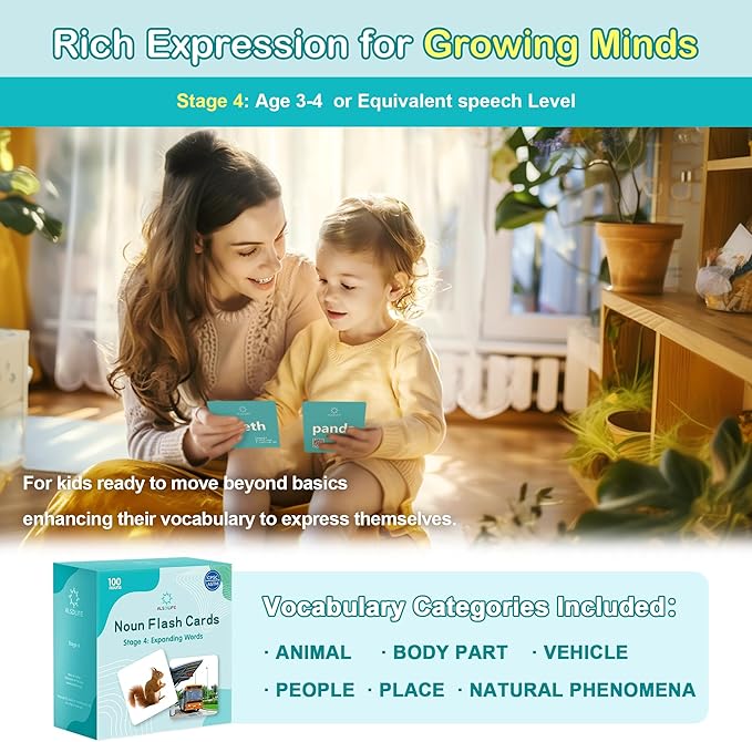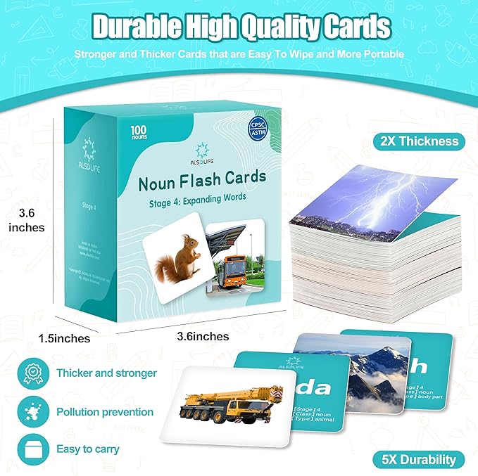 - 【Perfect for Developing Expanded Language Skills】ALSOLIFE 4th Stage Flash Cards feature 100 key words across categories like animals, body parts, people, locations, and natural phenomena. These cards help children progress from basic words to more complex terms, enhancing their ability to express thoughts and describe the world with greater detail.