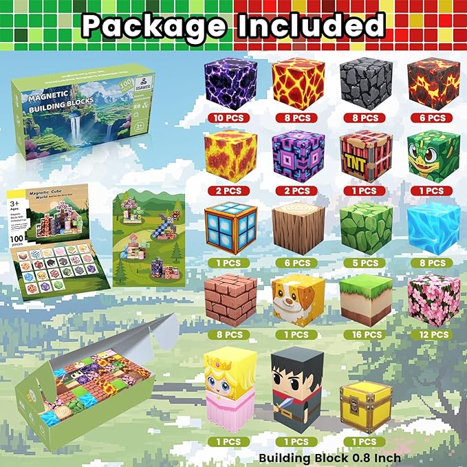 - đĄăMagnetic Cube Kit IncludeăIncludes 100 PCS magnetic cubes in 19 types. Creative booklet with storyline and beautiful patterns to keep them busy in a clever way. Unlike other magnetic toys on the market, our magnetic cube kit has 8 magnetic contect point, which makes it easier for toddlers over 3 years old to stick the cubes together and make the construction sturdy.
