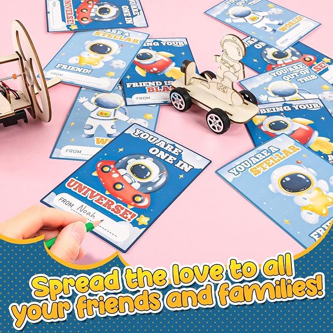 - 【Spread Love and Friendship】Along with the STEM kits, each set comes with 24 beautifully designed Valentine’s Day cards featuring 4 different astronaut themes. Each card includes a unique punchline and space to write a personalized message, helping children strengthen friendships and build connections. It’s the perfect way for kids to express their affection and appreciation while having fun assembling their own toys!