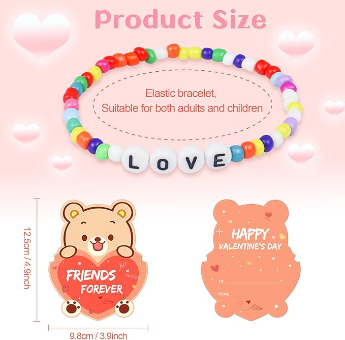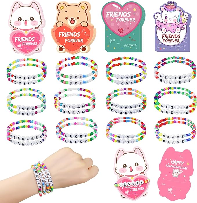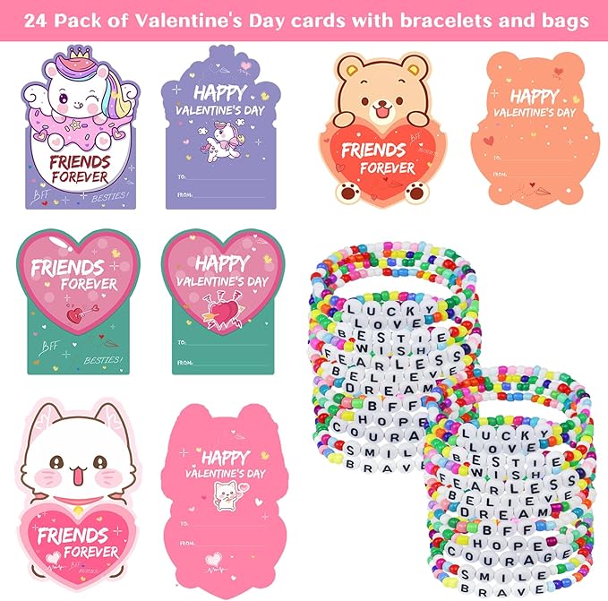 - Valentines Day Gift Cards for Kids: Valentine's Day Card Set contains 24 adorable Valentine's Day cards and 24 Pcs Colorful Friendship Bead Bracelets. Perfect for kids' valentines gift exchanges and Valentines classroom prizes party favors.