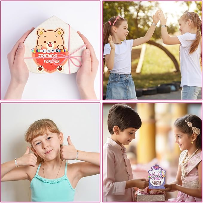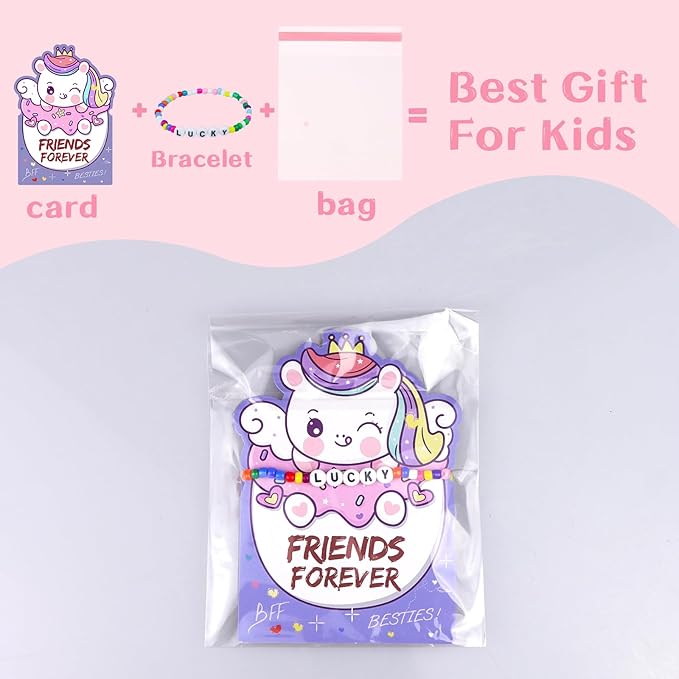 - Valentines Cards for Kids Classroom:Valentine's Day card set features 4 different cute Valentine's Day designs including unicorn, heart, sweet, bear and more. Each one is carefully designed. Cute and Unique. Kids will love them. These Valentines cards have a unique groove design to which the friendship bracelet can be attached. FRIENDS FOREVER GIFT FOR KIDS!