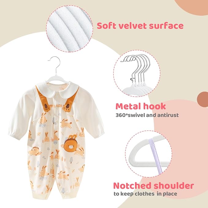 - [Baby Velvet Hangers]: The velvet baby hangers are made of premium quality ABS plastic and covered with non-slip soft plush velvet surface, feels so comfortable to the touch, and helping your clothes do not cause any shoulder bump and get wrinkled.