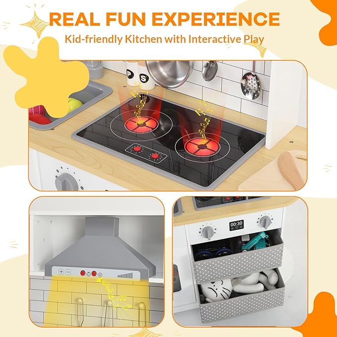 Wooden Play Kitchen for Kids - Innovative Corner Design, Realistic Cooking Sounds, Complete Accessories, Ample Storage Space, and Sound & Light Features