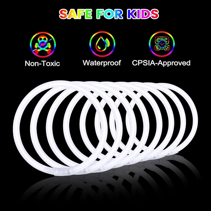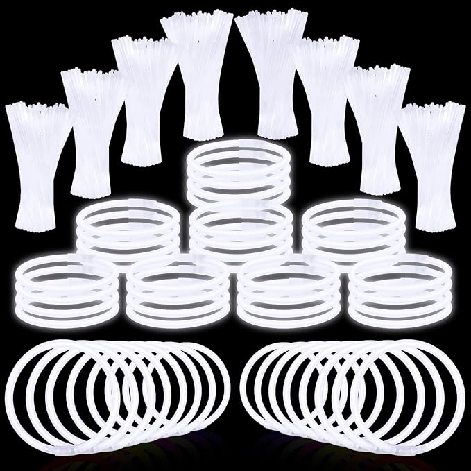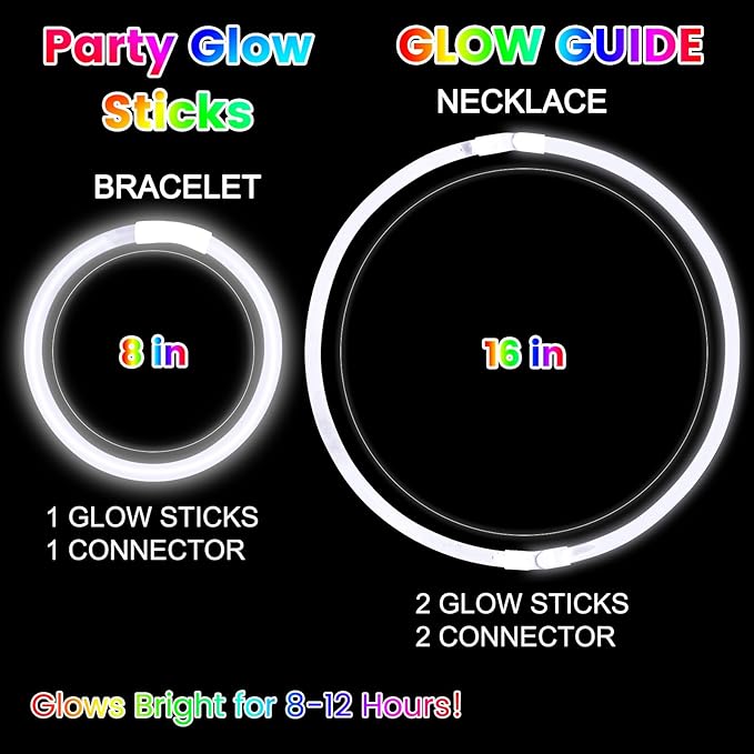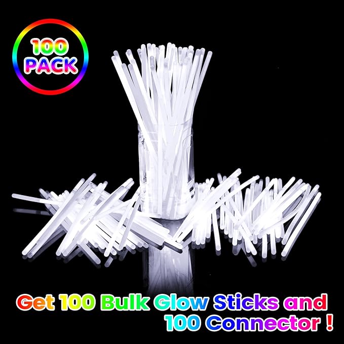 - White Glow Sticks Party Favors 100 Pack: Our glow sticks bulk party pack neon party decorations set includes 100 pcs of easy to activate and vibrant multi-colored light sticks plus 100 pcs of dependable connectors. Bend, snap, shake and you are ready to go! Just enjoy your party all night without worry they will fade away. Perfect glow in the dark party supplies to add more fun to your extra special party celebration!