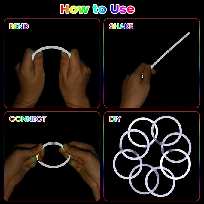 - Endless Nighttime Party Fun: Bend to activate them, Snap them along entire tubes, and shake them to start glowing in the dark with various bright colors. With our connectors, Whether you are make beautiful glow necklaces or glow bracelets, writing letters and numbers or creating party decorations, our glow party favors set has it all. These festival party supplies glow sticks bulk are perfect to nighttime keep any event lively! Perfect for glow in dark party supplies, neon themed party favors.