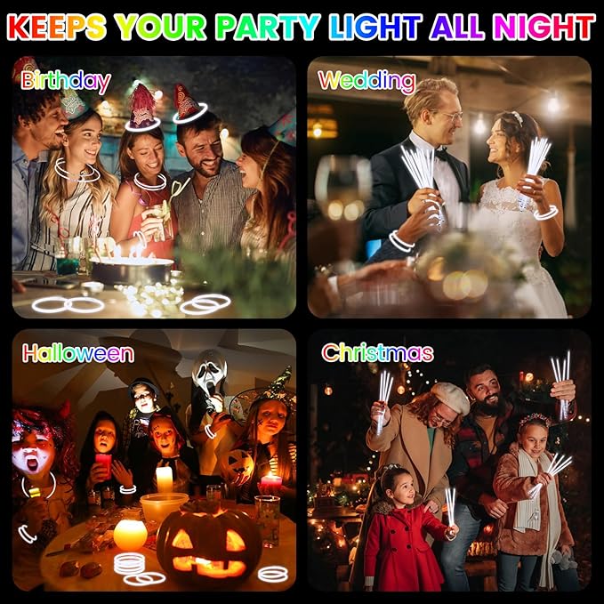 - Mulit-Use Party And Festival Decoration: Our glowsticks perfect for glow in the dark party supplies or holiday celebration event party decoration, glow party, birthday party, halloween trick or treat, christmas party, new year, valentine's day, easter, wedding, 4th of July patriotic, bachelorette party, carnivals, mardi gras, football party supplies, sports event, fireworks show, concerts, dance party, camping and so on. These festival bulk glow sticks set are perfect to keep any event lively!