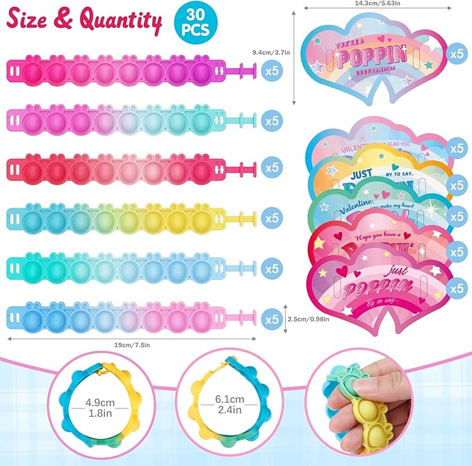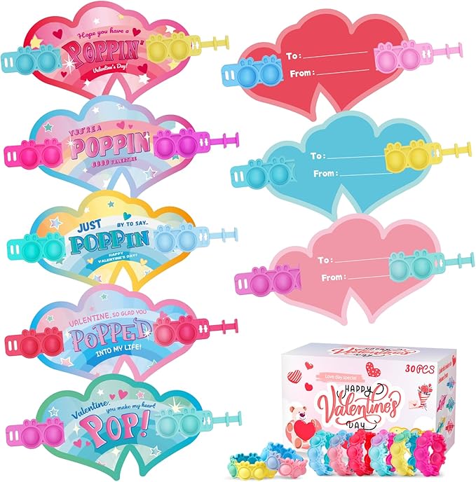 Valentines Day Gifts for Kids 30 Pack Pop Bracelets Fidget Toys Valentines Day Cards for Kids School Classroom Party Favors Valentines Exchange Gifts for Toddlers Girls Boys Class Prizes