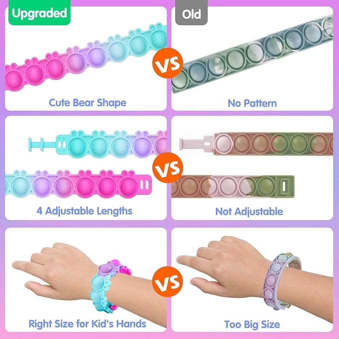 - Sensory Fidget Toys For Kids: Pop Bracelets with mix color designs are not just cute, they also offer stress relief and a calming sensory experience. Beyond the holiday, these cute fidget toys are indispensable tools for kids of all ages, reducing anxiety and bringing relax whenever needed
