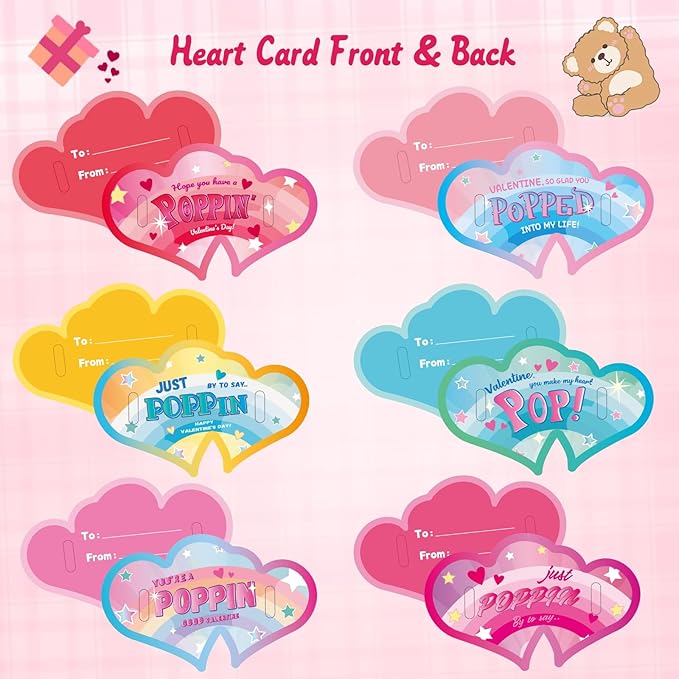 - Valentines Cards For Kids Classroom: This pack includes 30 pop bracelets party favors for kids (6 designs) and 30 Valentines day cards (6 designs). Designed for kids, the bear Pop bracelet features a unique pattern bubble design that is colorful and fun