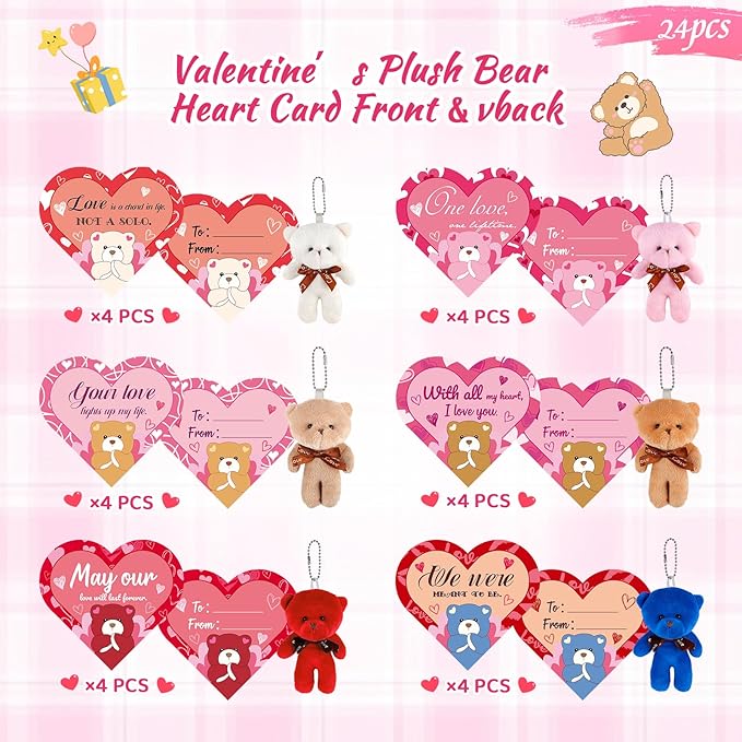 - Unique Valentines Party Favors Set: Our Valentine's day gift set includes 24 Valentine mini plush bears (6 styles), 24 cute greeting cards (6 styles), 24 individual packages. These cute Valentines plushies and card for kids are an excellent way for Valentines exchange gifts for kids and Valentines party favors