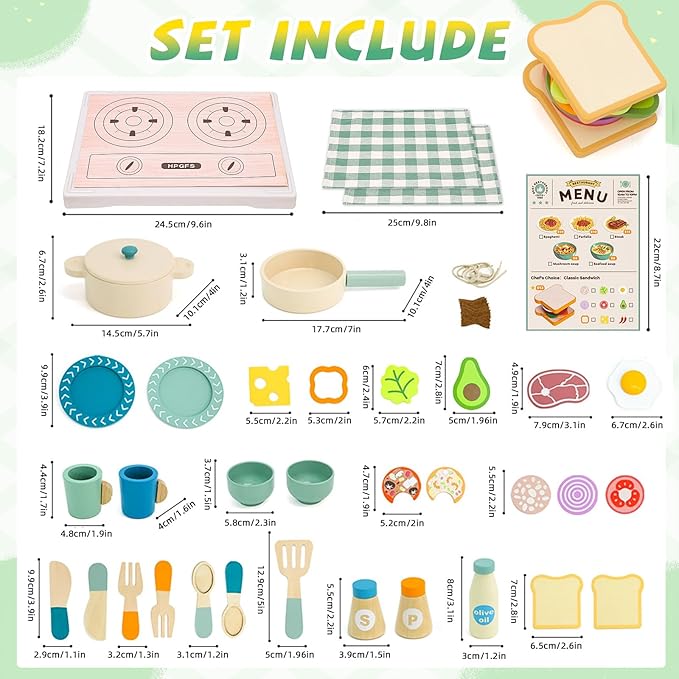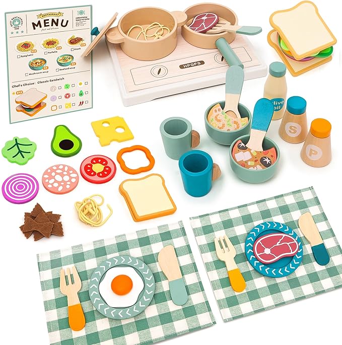 - FUN TO LEARN: The wooden kitchen set allow kids to get away from the screen and exercise their hands-on skills, communication skills, etc. during play. Rich pretend food accessories and soft colors can stimulate children's imagination, cultivate their creativity and improve their knowledge of food colors. This toy kitchen sets is a rare early education toy.