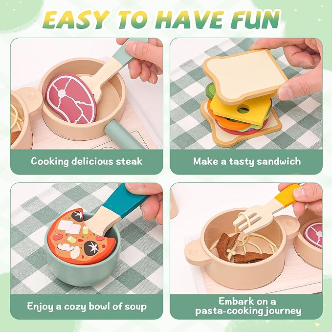 Wooden Play Cooking Set, Kids Pretend Play Kitchen Accessories Toys Set, Includes Play Plates, Pots, Bowls, Pans, Cutlery, Includes Fake Food, Gift for 3 4 5 Years Old Girls Boys for Birthday