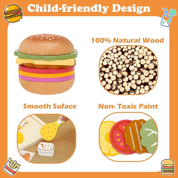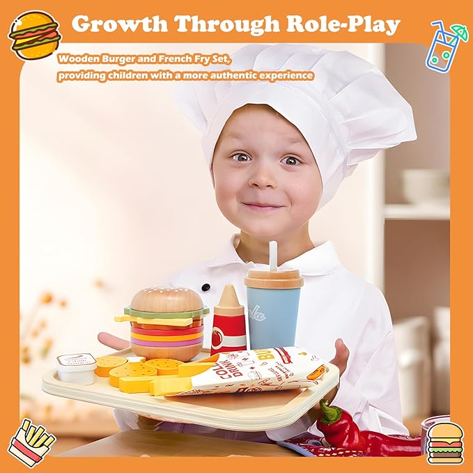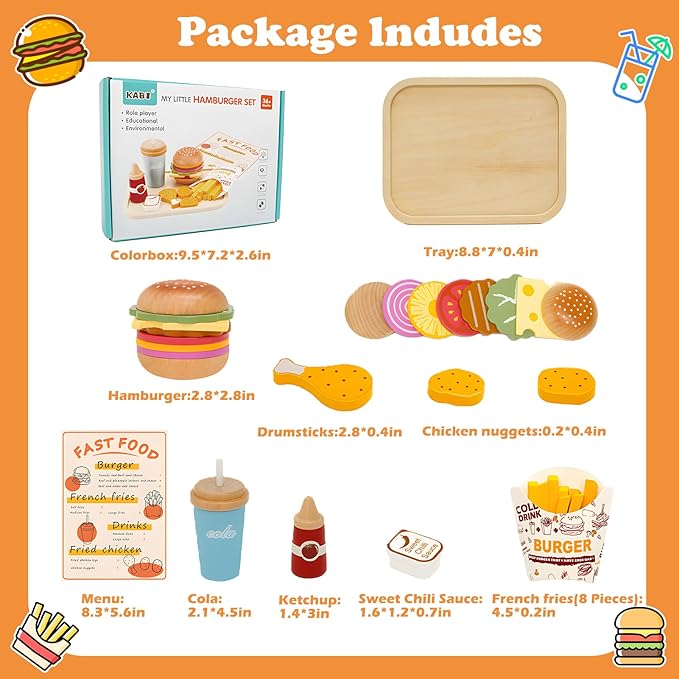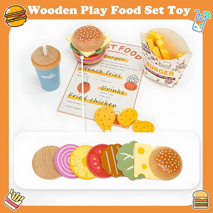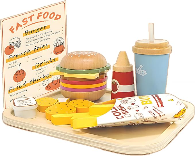 - Realistic Play Experience: This Wooden Play Food Set Toy for Play Kitchen is designed to provide a realistic play experience for toddlers. The set includes a wooden hamburger, French fries, and other fast food items that look just like the real thing