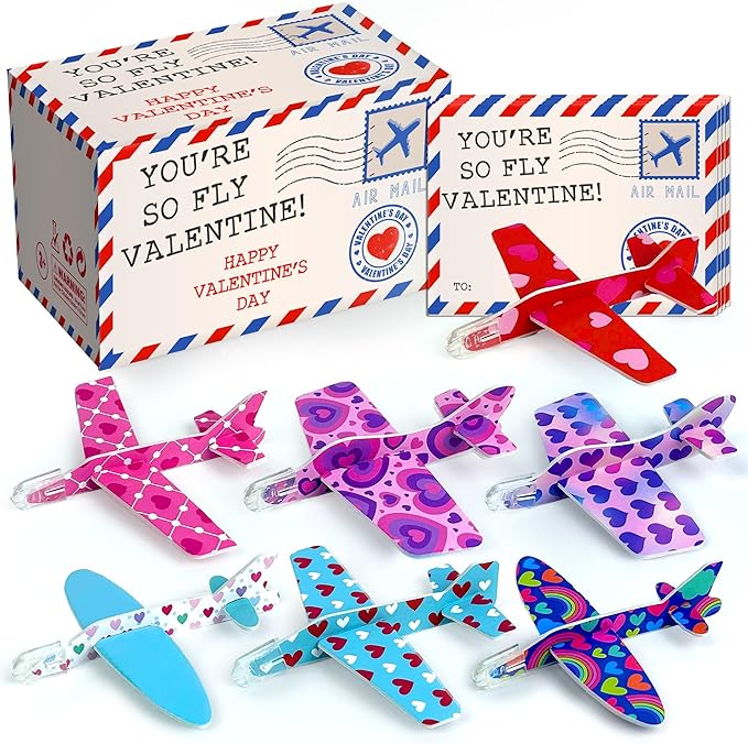 - 7-Design Valentines Day Gifts for Kids - This Valentines Day Exchange set features a blend of 7 different foam airplane designs, each with a bright and playful pattern. These Valentine cards for kids come with 7 different fun greetings like “You make my heart soar!” and “I’m plane crazy about you!” Each airplane is designed to be simple to assemble, making it a d