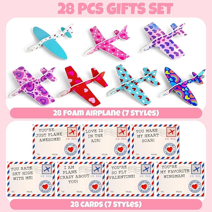 - Valentines Day Gift Set with Lots of Fun - Our Valentines Day Foam Airplane Gifts set includes 28 beautifully designed Valentine cards, each featuring a fun foam airplane. These Valentines Day Gifts for Kids offers 7 unique airplane designs, with 7 designs for the Airplane Valentines Day Cards, ensuring a variety of cute, colorful patterns for every child. Each Valentines Day Card comes with a corresponding airplane toy, making them perfect for school classroom exchanges or family fun
