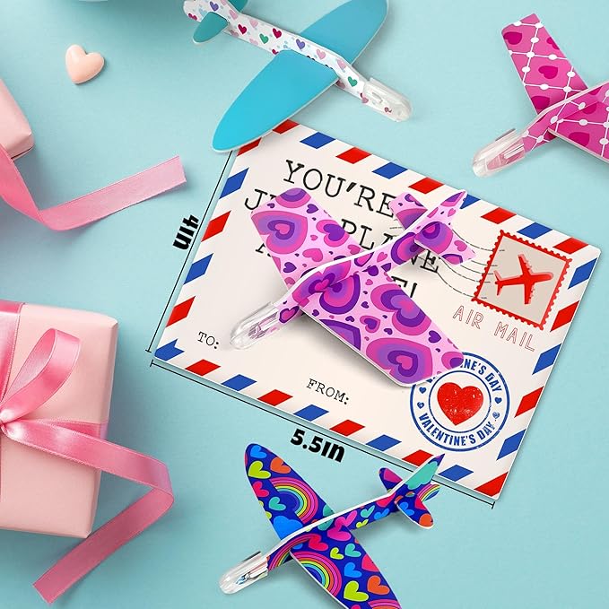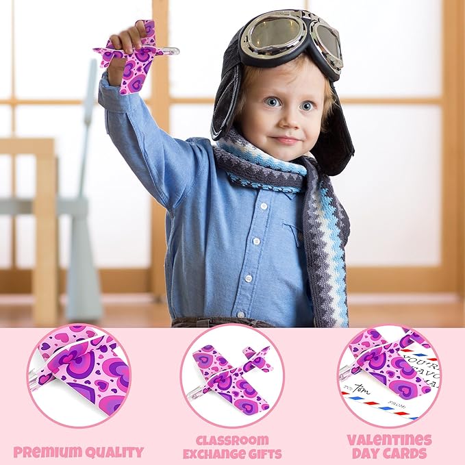 - Premium Material Airplane Valentines Day Cards - Crafted from lightweight foam, our foam airplanes are a safe and fun Valentines Day gift for kids aged 3 and up. These soft yet durable planes are designed to fly smoothly without causing harm to furniture or indoor spaces. These Valentines cards for school are printed with vibrant, non-fading colors and cute patterns that will excite any child. Super quality and fun gameplay can make your child the star of the class