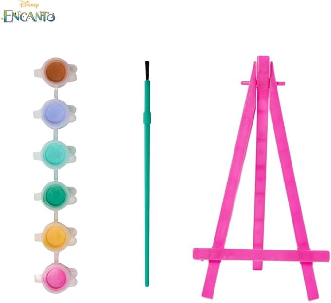- DIY CRAFT PAINT SET – A complete Encanto paint set includes three Encanto canvases (3.9x5.9 each), an easel, 6 paint pots in planned colors, and a paintbrush.