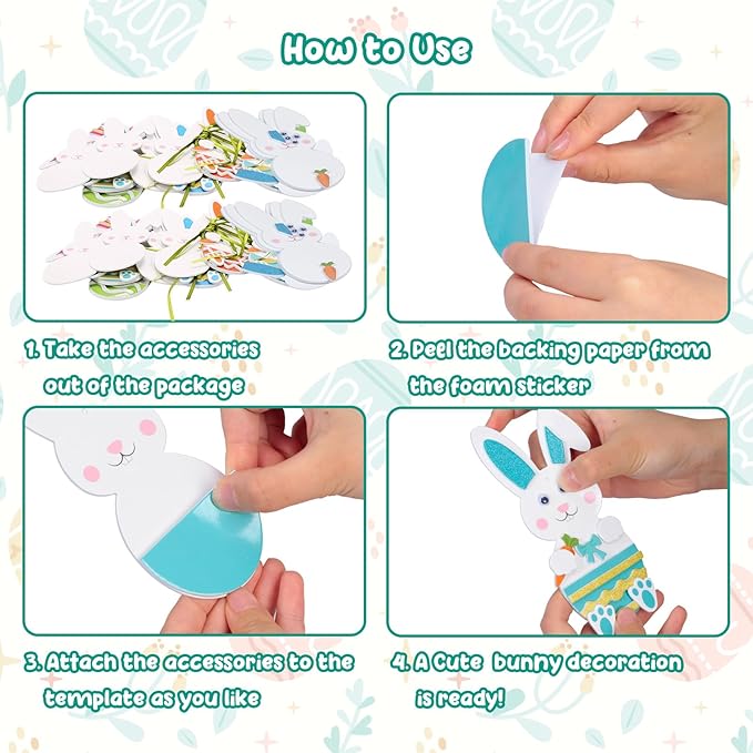 - Easter Craft Kit for kids:The EVA foam bunny craft for kids includes 24 pack of Easter bunny craft kits(6 designs, 4 of each),such as bunny,foot,carrot, tie. etc,and have a lot of Easter bunny foam stickers enough quantity to meet needs on a activity for kids,kids can make their own Easter arts crafts set to create a Easter atmosphere!