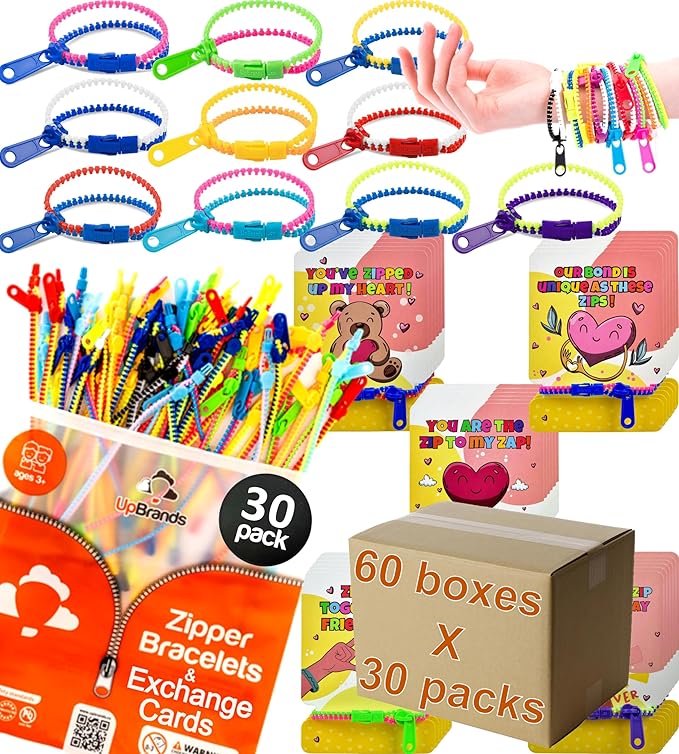 UpBrands Case Pack of 60 Boxes x 30 Valentine's Day Cards with Bi-Color Fidget Zipper Bracelets Per Box – Bulk Valentine’s Gifts for Schools, Charities, and Businesses