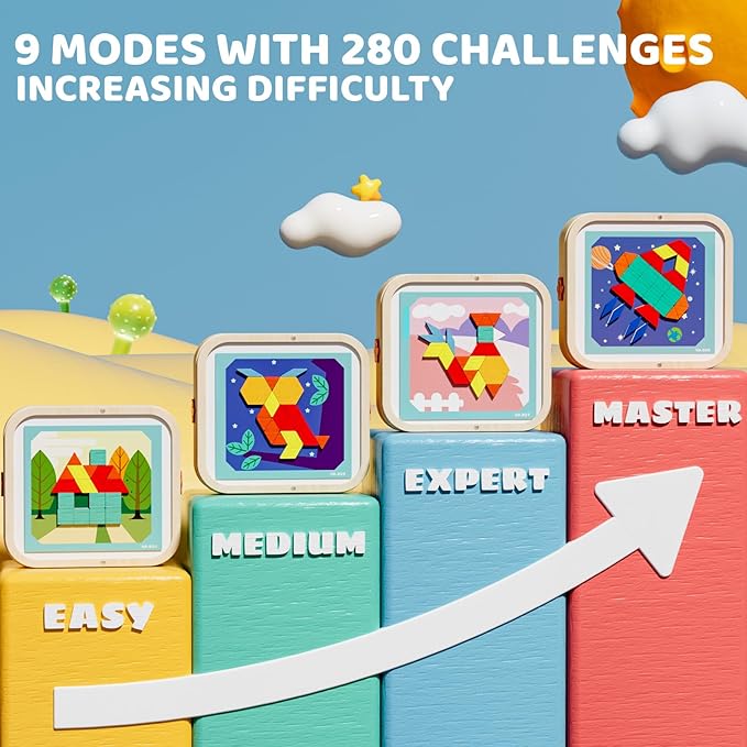 - Easy to Store: The tangrams are made from high-quality wood with smooth, rounded edges, ensuring safe play for kids ages 4-8. With over 10 vibrant colors and geometric shapes, kids can create any pattern they imagine! The compartmentalized storage box also helps develop sorting and organizational skills.