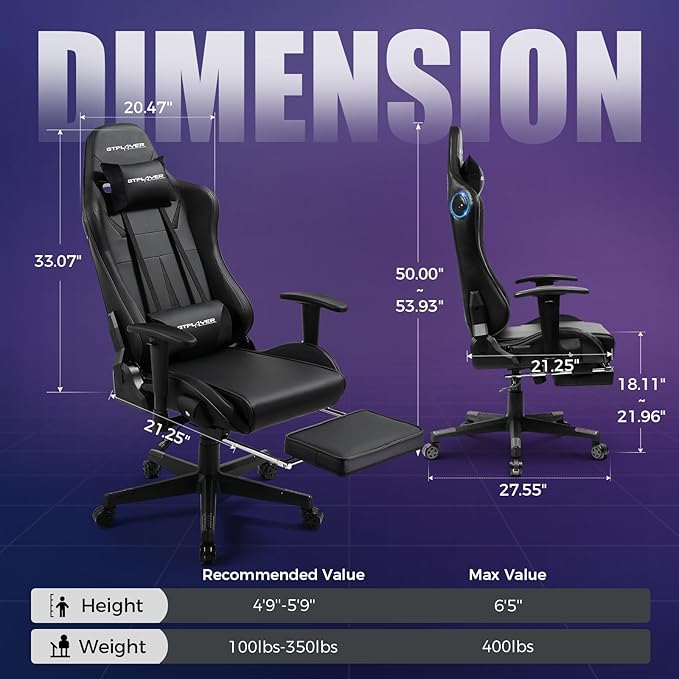 - 【ERGONOMIC DESIGN】Our video gaming chair with Footrest & Adjustable armrests & Height Adjustable(3.94in), When you don’t want to straighten your back and sit, just take out the footrest, put your feet up, Adjust the seat to the proper height,turn on your favorite music, and start enjoying the comfort